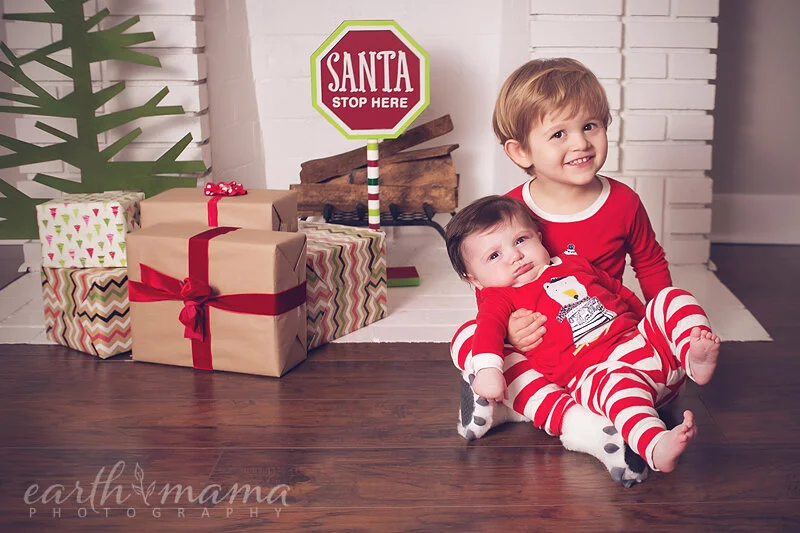 Beautiful Holiday Mini Sessions in our Pop-Up Shop in McKinney, Texas. Set up includes our canopy wood bed draped in garland and our fireplace set up with tree and leather chair.